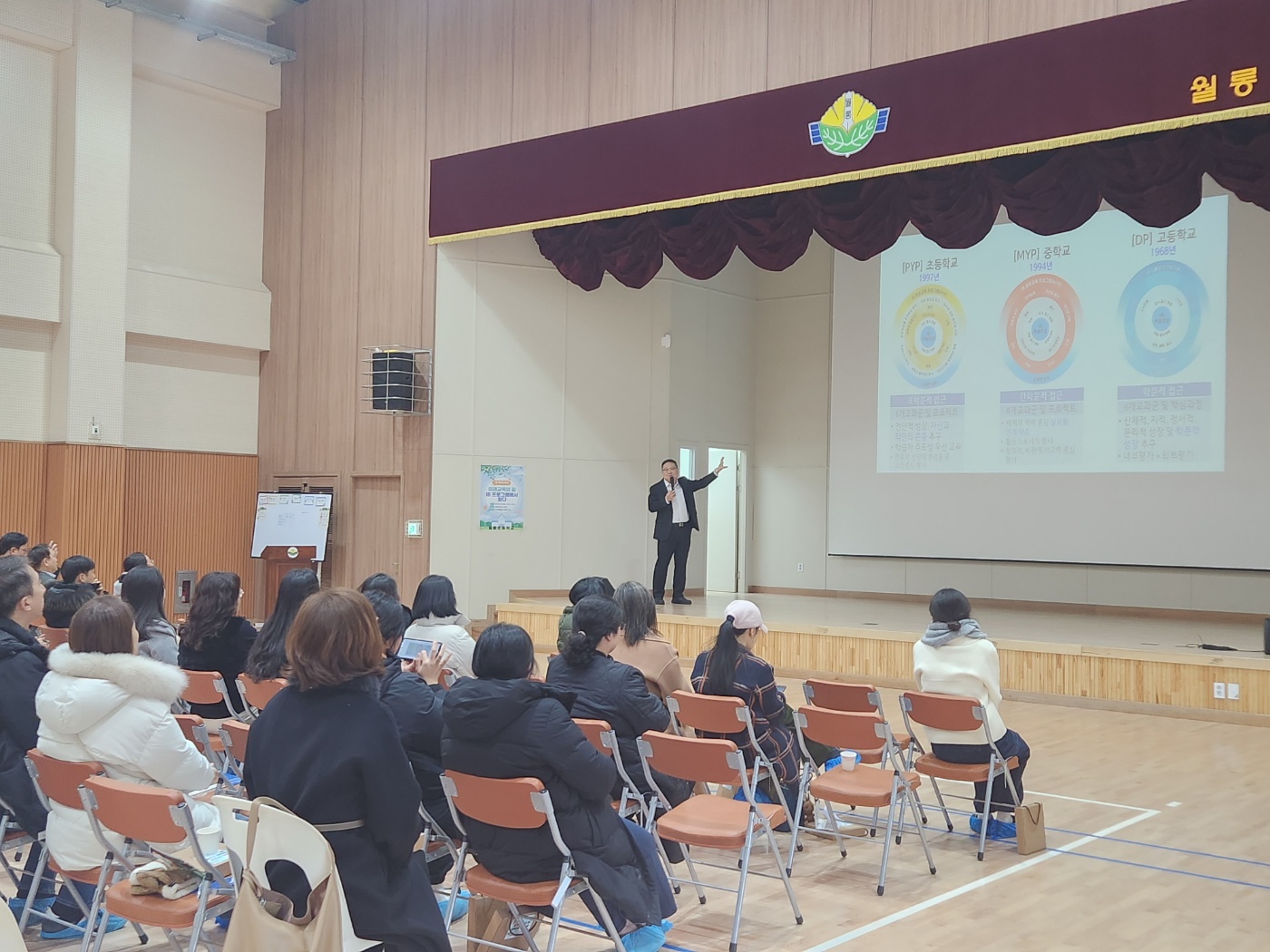 파주 월롱초등학교(교장 김상용)는 12월 5일(금), ‘미래교육의 길, IB 프로그램에서 찾다’를 주제로 인덕원중학교 김태훈 교장을 초청해 관내 학부모 대상 IB 특별 연수를 실시했다. 이번 특강은 IB 교육에 대한 정확한 이해를 제공하고, 변화하는 미래교육 환경에서 학교가 나아가야 할 방향을 제시하고자 마련되었다.