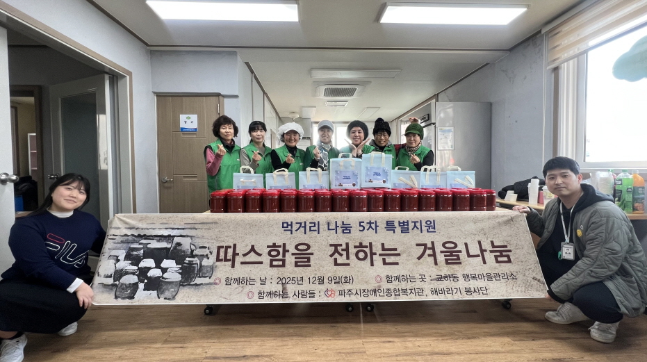 교하동 행복마을관리소에서 진행된 이번 활동에는 해바라기봉사단 단원 10명이 자원봉사자로 참여해 직접 수제 고추장을 담그고, 이를 독거장애인 및 저소득 장애인 50가정에 전달했다. 특히 연말 한파가 예상되는 시기에 취약계층 가정에 필수 먹거리와 따뜻한 마음을 함께 전달한 이번 지원은 더욱 뜻깊었다.