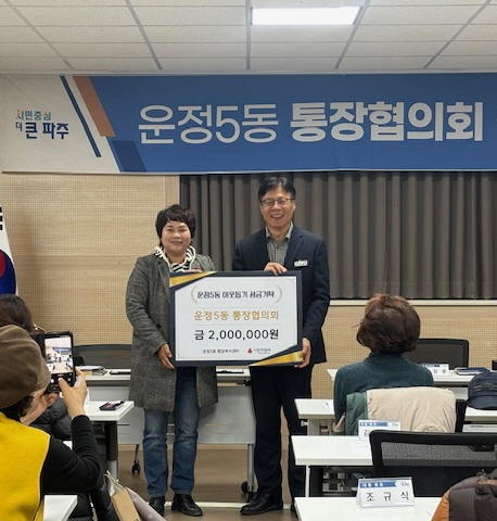 파주시 운정5동 통장협의회는 지난 11일 운정5동 행정복지센터를 방문해 이웃 돕기 성금 200만 원을 기탁하며 따뜻한 연말 나눔을 이어갔다고 전했다.