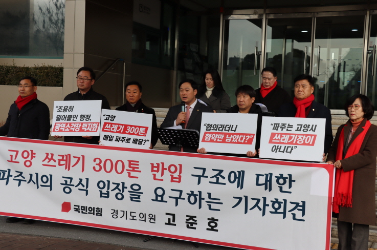 경기도의회 고준호 의원(국민의힘·파주1)이 15일 파주시청 본관 앞에서 기자회견을 열고, 파주시가 추진 중인 700톤 규모 광역 소각시설 사업과 관련된 행정 절차 문제를 강하게 비판하며 시민 중심의 투명한 행정을 촉구했다.
