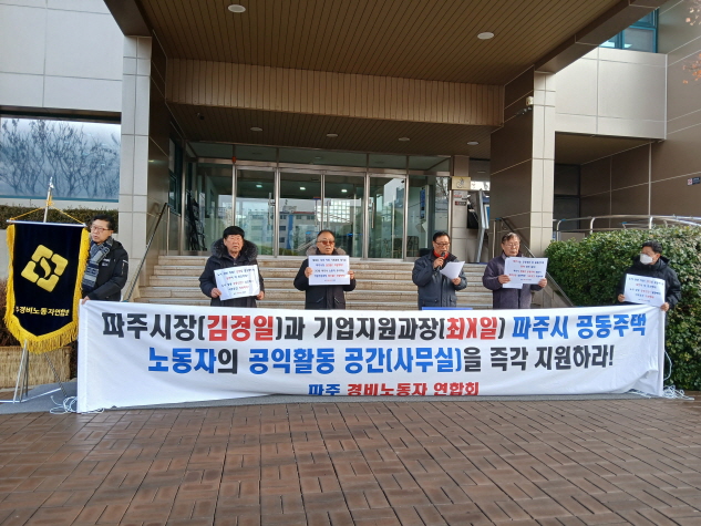 12월 29일(월) 파주시청 본관 입구에서 파주경비노동자연합회(회장 이종학. 이하 연합회)가 “파주시는 파주경비노동자연합회의 사무공간을 지원하라”는 기자회견을 가졌다.