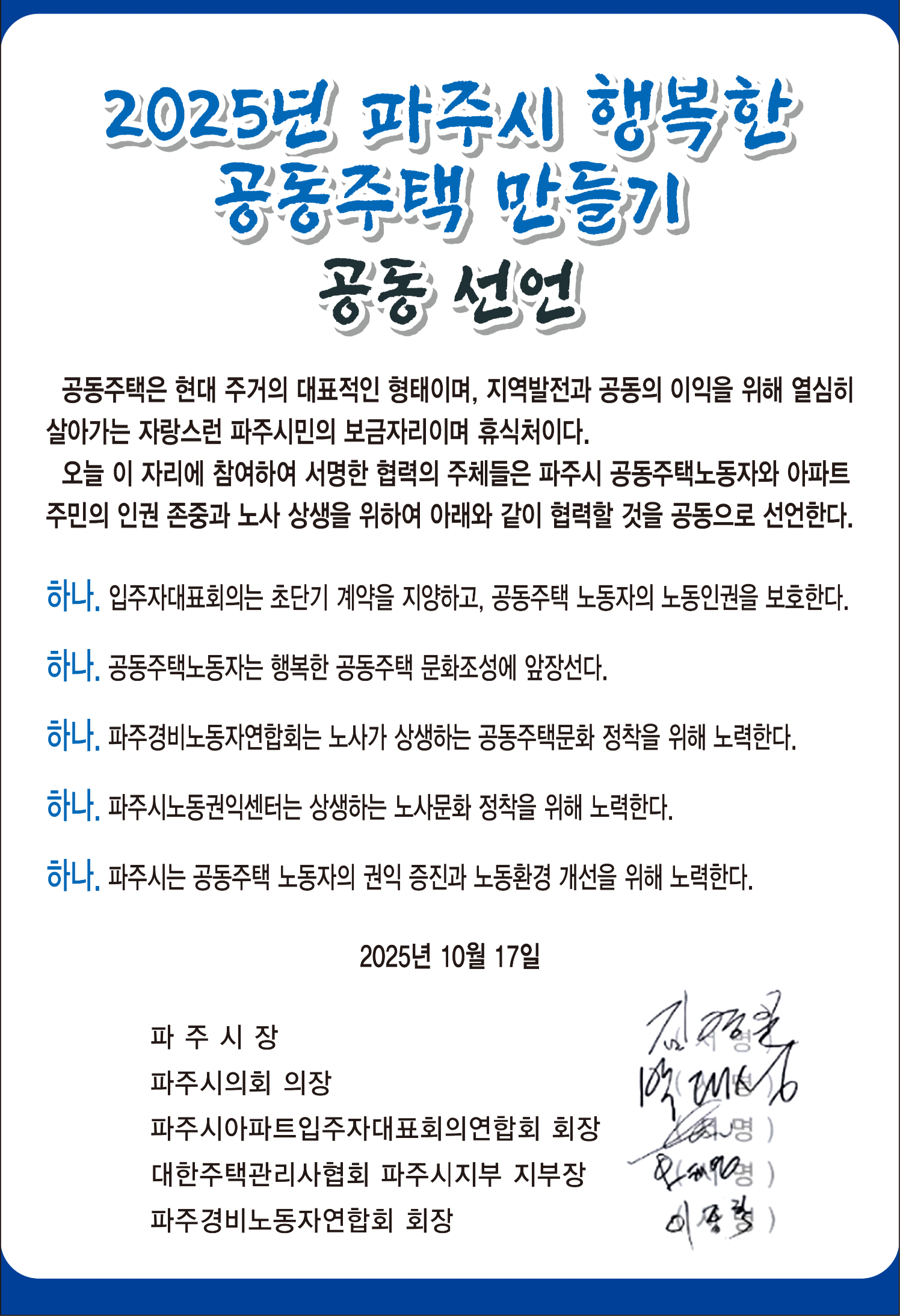 - ‘공동주택 노사 상생협력 공동선언’ 및 ‘파주시 노사관계 발전 지원 조례’ 근거