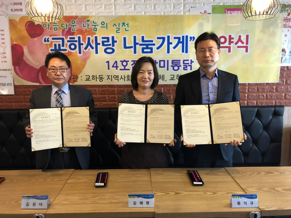 파주시 교하동 행정복지센터(동장 윤덕규)는 지난 4일 교하사랑협의체가 교하사랑 나눔 가게 14호점으로 삼미통닭을 선정하고 업무 협약식을 체결했다고 밝혔다.