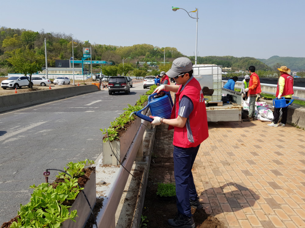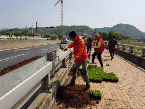 이날 행사에는 법원읍 주민자치위원뿐 아니라 아프리카봉사단(단장 김봉수), 관내 3273부대 군장병들이 참여했으며 법원읍 내 주요교각 3개소에 사피니아 2,400주를 심었다.
