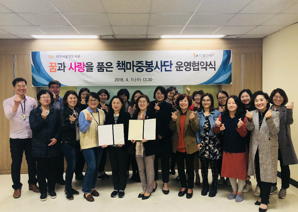이날 중앙도서관에서 가진 협약에서 중앙도서관과 파주시 드림스타트센터는 취약계층의 아동에게 건강하고 행복한 사회구성원으로 성장할 수 있도록 책을 매개로 한 책마중봉사단을 운영키로 하고 이를 위한 상호협력과 지원을 약속했다.