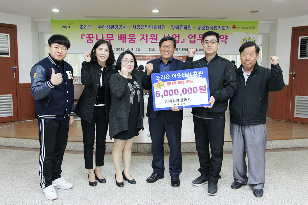 파주시 조리읍 행정복지센터(읍장 김순태)는 지난 9일 ㈜아침환경공사(대표 김영철·유명기) 및 관내 3개소 학원장이 참석한 가운데 저소득층의 사교육비 부담 해소와 교육기회 제공을 위한 ‘꿈나무 배움 지원 사업’ 업무협약을 체결했다고 밝혔다.