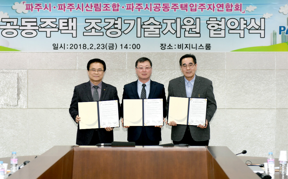 파주시는 지난 23일 파주시청 비즈니스룸에서 김준태 파주시 부시장과 이성렬 파주시산림조합 조합장, 김시헌 파주시 공동주택 입주자 연합회 회장 등이 참석한 가운데 ‘공동주택 조경기술 지원 협약’을 체결했다.