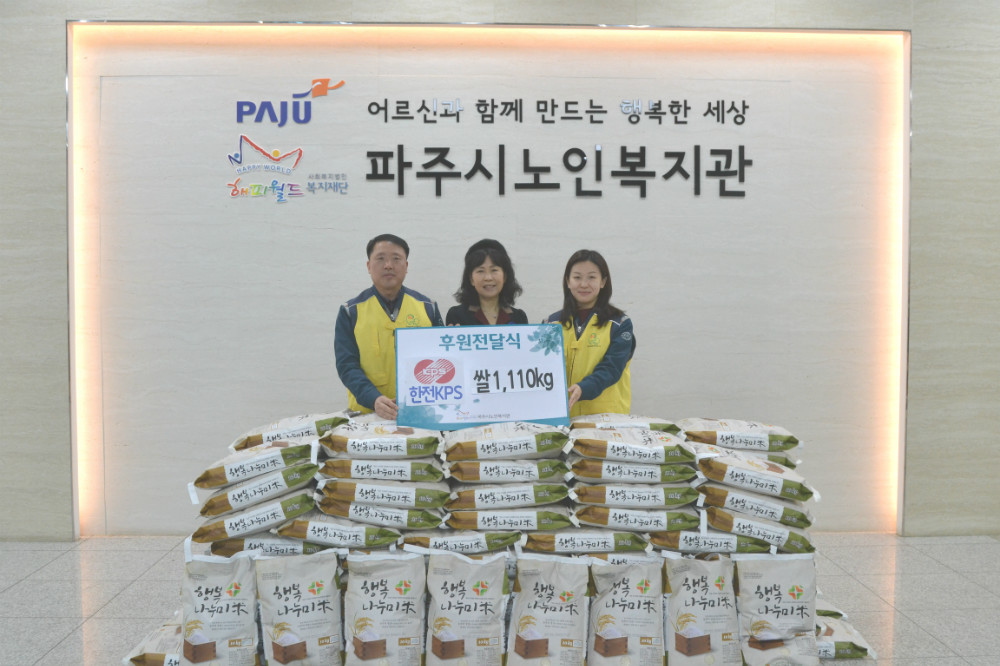지난 12일 한전KPS 파주사업소에서는 노인돌봄기본서비스사업으로 파주시 내 독거어르신 1천81명을 관리하고 있는 파주시노인복지관에 쌀10kg 111포를 전달하며 지역사회 문제를 함께 고민하고 파주시 독거어르신을 위한 따뜻한 선물을 보냈다.