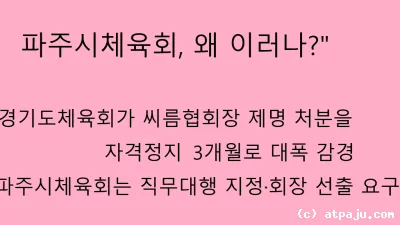 파주시체육회의 씨름협회장 제명 처분, 경기도체육회가 자격정지 3개월로 대폭 감경- 경기도체육회의 결정이후 직무대행 지정·회장 선출 요구 - “파주시체육회 왜 이러나?” 파주시체육회 스포츠공정위원회가 파주시씨름협회 배수용 회장에게 내린...