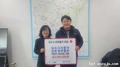 파주시자동차전문정비협회, 취약계층을 위한 성금 500만 원 파주시에 기탁 파주시는 지난 22일, 파주시자동차전문정비협회가 파주시청을 방문하여 관내 취약계층을 위해 써달라며 현금 5백만 원을 기탁...