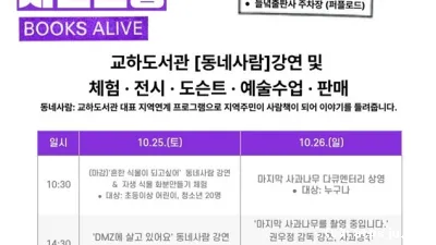 파주시 교하도서관은 오는 25일부터 26일까지 파주출판도시에서 열리는 ‘2025 파주페어 북앤컬쳐’에서 디엠제트(DMZ) 식물·곤충·사과’를 주제로 사람책 강연과 체험 프로그램을 운영한다. 25일에는 디엠제트 자생식물을 소개하는 ‘흔한 식...