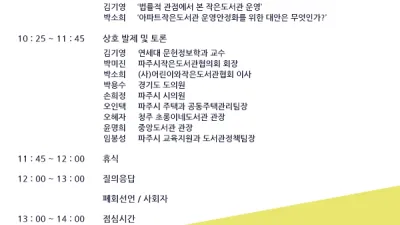 파주시작은도서관협의회는 공동주택 작은도서관의 활성화를 위한 포럼을 20일 파주시 중앙도서관 4층 문화강좌실에서 개최한다. 올해 초 개정된 공동주택관리법 시행령 29조에 의한 ’공동주택 작은도서관 외부개방 문제’란 주제로 도서관법과 공동주택관리법이 상충돼 혼란을 겪...