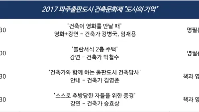 신청 바로가기>> 9/15(금)~9/17(일) 동안 파주출판도시 일대에서 진행되는 “파주북소리 2017″ 프로그램으로, 9/17(일) 2017 파주출판도시 건축문화제 “도시의 기억”이 진행됩니다. (참가 및 관람무료) 출판과 건축의 만남으로 세계적으로 주목...