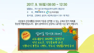파주시는 2017년 탄현살래길 시민건강걷기대회를 성공적으로 지원하고 행사에 참여하는 시민들과 청소년들이 자신의 건강 수준을 체크해볼 수 있는 금연사랑 건강증진 홍보관을 운영한다. 이번 행사는 16일 오전 8시~오후 12시 파주 통일동산에 위치한 축구국가대표트레이닝...