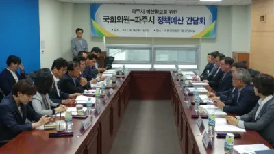 파주시, 정치권과 소통․협력의 장 마련 - 8일, 파주시-국회의원 정책간담회 개최 파주시가 지역현안 해결과 국도비 확보를 위해 국회의원들과 머리를 맞댔다. 파주시는 8일 국회의원회관에서 윤후덕, 박정 국회의원과 ‘정책간담회’를 가졌다. 이번 간담회는 정·관이 ...