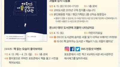 다독다독, 꿈을 응원하는 파주 교하도서관 - 도서관주간과 세계책의 날 맞이 이벤트 진행 파주시 교하도서관이 제53회 도서관주간(4월12~18일)과 세계의 책(4월23일)을 맞아 ‘다독다독(多讀多讀), 내 꿈을 응원해주는 도서관’을 주제로 다양한 독서프로그램과 ...