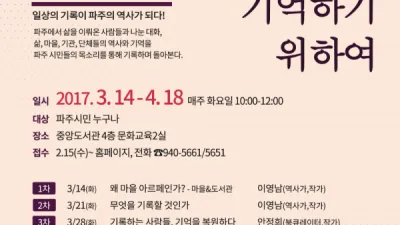 파주시 중앙도서관, 마을아카이브 프로젝트 추진 ‘사라져가는 것들을 기억하기 위하여’ 파주시 중앙도서관이 파주시의 빠른 도시화 과정 속에 사라지는 것은 무엇이고 기억해야 할 것은 무엇인가를 화두로 마을아카이브 프로젝트를 추진한다. 잊히거나 숨겨진 파주 시민 개인...