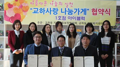 파주시 교하사랑 나눔 가게 1호점 “아이블럭”과 협약식 개최 교하동 지역사회보장 협의체가 25일 아이블럭(대표 백승일, 원장 고민정)과 함께 이웃사랑을 실천하기 위한 교하사랑 나눔 가게 1호점 협약식을 개최했다. 아이블럭은 협약식을 통해 교하동 저소득층 아동...