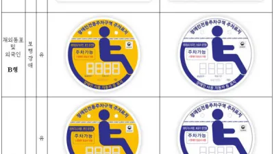 파주시, 13년만에 전면 교체된 장애인자동차표지 안내 「장애인·노인·임산부 등의 편의증진 보장에 관한 법률」이 개정됨에 따라 올해부터 기존에 사용하였던 장애인자동차 주차가능표지가 13년 만에 전면 교체된다. 또한 장애인자동차 주차표지 명칭을 ‘장애인자동차표지’...