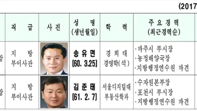 경기도, 17년 상반기 실국장·부단체장 정기인사 단행 ○ 송유면 파주부시장을 자치행정국장으로 김준태 수자원본부장을 파주시 부시장으로 각각 발령 ○ 도정 주요시책을 적극 추진하여 성과를 거둔 간부 우선 선발 ○ 행정․기술, 고시․비고시 등 균형 인사 실시 경기도는 ...