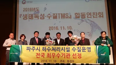 파주시 공공하수처리시설, 수질TMS 전국 최우수상 수상! 파주시(시장 이재홍)가 환경부와 한국환경공단이 주최한 ‘2016 수질TMS 우수운영사례 공모전’에서 전국 최우수사업장으로 선정돼 환경부장관 표창을 받았다. 수질TMS(TeleMonitering sy...