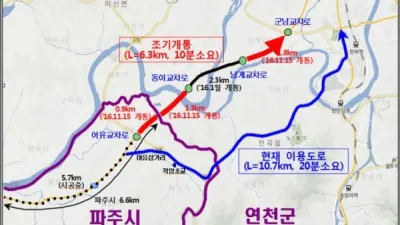 파주시 어유터널 4㎞ 조기개통 (적성~전곡간 도로확포장공사) 적성~전곡간 도로확포장공사 구간중 도로이용자 불편을 조기 해소하고자 어유교차로(어유터널)~동이교차로(3공구, 2.2km), 남계교차로~군남교차로(1공구, 1.8km) 구간이 15일 조기개통 됐다....
