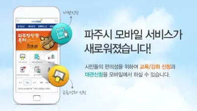 「모바일파주」에서 간편하게 교육신청하세요! 파주시 교육·체육시설 대관 모바일 서비스 오픈 파주시 모바일 대표 홈페이지 「모바일파주」를 통해 스마트폰으로 편리하게 각종 교육 및 체육시설 대관 신청을 할 수 있게 됐다. 파주시는 10월 29일부터 교육문화회관 강좌, ...