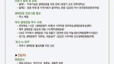 파주시, 제3회 경기생태관광 한마당 개최 생태관광 활성화를 위한 첫걸음 파주시(시장 이재홍)는 생태관광 가치를 발견하고 지속가능한 관광 및 지역사회 활성화를 위한 제3회 경기생태관광 한마당을 임진각(DMZ생태관광지원센터)에서 20일(목)~21일(금) 1박2일 ...