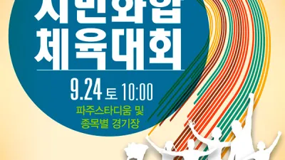 44만 파주시민 화합의 장으로 “2016 시민화합 체육대회” 9월 24일 개최 44만 파주시민의 화합한마당 축제인 “2016 시민화합 체육대회”가 오는 24일 파주스타디움 및 종목별 경기장에서 성대히 펼쳐진다. 이번 체육대회는 2007년 대회 개최 이후 9...