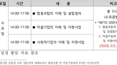 협동조합 등 사회적경제기업 설립을 꿈꾼다면, 주목! <주요 내용>○ 마을기업, 협동조합, 사회적기업의 설립절차, 지원제도에 대한 무료 상시교육 프로그램 매월 2/3/4주 수요일마다 운영 ○ 교육기회 확대로 사회적경제에 대한 올바른 이해와 활성화에 기여 ...