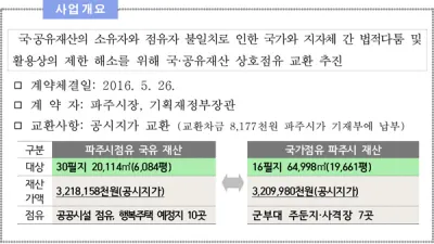 파주시, 시유지와 국유지 교환계약 체결성공 - 군부대 땅은 국가로, 시 공공시설은 시소유로 - 기획재정부와 파주시가 지난 5월 26일 국·공유재산 교환계약을 체결했다. 이번에 체결한 국·공유재산 상호점유 교환은 국가가 점유한 시유지와 시가 점유한 국유지를...