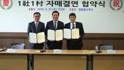 『법원(法院)끼리 자매결연 맺어, 지역에 화제』 파주시 법원읍(동문1리)-의정부지방법원 고양지원 자매결연 맺어 ▲법원읍(읍장 차정만), 동문1리(노연복 이장), 의정부지방법원 고양지원(고영구 지원장)이 앞으로 상호교류를 위한 자매결연 협약서에 서명후 기념촬영을 하...
