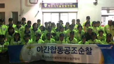파주시자율방범연합대 야간 합동순찰 실시 파주시자율방범기동순찰연합대는 지난 24일 금촌 전 지역에 대한 야간 합동 순찰 활동을 실시했다. 연합대 및 각 읍면동 자율방범대 대원 50여명이 모여 진행된 이번 합동 순찰은 금촌로데오, 로터리 등 우범지역을 순찰해...