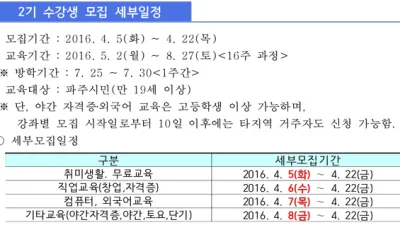 파주시교육문화회관, 2016년 2기 수강생 모집... 4월 5일부터 접수! - 직업교육, 취미생활, 컴퓨터, 외국어 교육 등 114개 강좌 운영 - ○ 파주시 교육문화회관은 2016년도 2기 프로그램을 마련, 오는 4월 5일부터 수강생을 모집한 다. ○ 2...