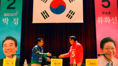 국회의원선거(파주시 을) 후보자 정책토론회 열려 박정 더불어민주당 vs 류화선 무소속황진하 새누리당 후보는 불참 알려와 ▲박정 후보와 류화선 후보가 악수를 하는 사이로, 불참을 통보한 새누리당 황진하 후보의 빈자리가 보인다. 3월 27일 파주시민회관에서 제2...