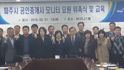 파주시, 공인중개사 모니터 요원 위촉식 개최 파주시는 지역 내에서 발생되는 불법중개행위를 자율적으로 모니터링해 건전한 부동산 거래질서를 확립하고자 공인중개사 모니터 요원 15명에 대한 위촉식을 3월21일 실시했다. 이날 위촉장을 수여받은 공인중개사 15명...