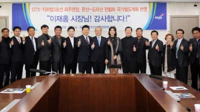 파주시주민자치연합회, 파주시장에 감사패 전달 - GTX‧지하철3호선 파주연장, 문산~도라산 전철화 반영에 감사 - 파주시주민자치연합회(회장 백광현)는 이재홍 파주시장에게 21일 GTX‧지하철3호선 파주연장, 문산~도라산 전철화 3개 사업의 ‘국가철도망 구축계...