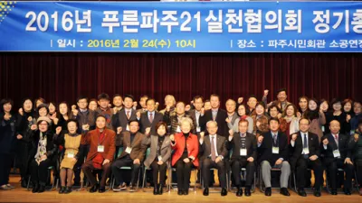 “푸른파주21실천협, 2016년 정기총회 개최” 푸른파주21 실천협의회(상임대표 김성희)는 지난 24일(수) 시민회관 소공연장에서 회원 100여명이 참석한 가운데 정기총회를 개최했다. 2015년 유공자 표창 수여를 시작으로 2015년 결산보고, 2016년도 사...