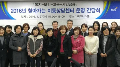 - 보건․복지․일자리․채무상담을 한 자리에서, 파주형 현장상담 복지서비스 - 파주시 『찾아가는 이동상담센터』 운영간담회 열어 파주시 무한돌봄희망센터는 지난 1월 27일 ‘찾아가는 이동상담센터’ 운영 간담회를 협업기관과 함께 갖고 2016년도 사업 활성화를 위...