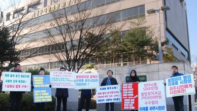 이재홍 시장 ‘뇌물수수 혐의’ 첫 재판대책위는 사건 재배당 진정서 제출 ▲법원 정문에서 파주시장비리 진상규명 대책위가 시위를 벌이고 있다. 12월 8일 화요일 오전 10시 의정부지방법원 고양지원에서 이재홍 파주시장과 부인 유양숙 그리고 김임준 ‘뉴일신관광’ 대표이사에...