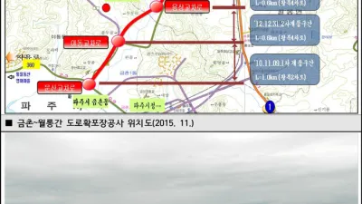 파주시 LGD 산단 교통 인프라 구축 및 통일로 교통체증 해소 -지방도 360호선 금촌~월롱 전체구간 개통- 파주시는 지방도360호선 금촌~월롱간(L=4.75km, B=20m, 왕복4차선)도로확포장공사에 총사업비 1157억원을 투입하여 2005년 01월 공사 착공,...