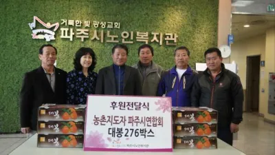 농촌지도자파주시연합회 대봉감 노인복지관에 전달 !- 파주시 관내 어르신에게 대봉감으로 사랑을 나누다 - 농촌지도자파주시연합회(회장 이갑영)는 추운겨울 어르신들의 겨울철 건강증진과 사랑을 나누기 위해 지난 23일 관내 어르신들에게 파주시노인복지관과 연계하여 대봉감 전...
