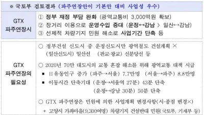 GTX!! 파주까지 포함하여 민자로 추진- 국토부, GTX 파주연장 기재부에 민자 타당성 분석 검토 의뢰 - 수도권광역급행철도(GTX) 파주연장에 파란불이 켜졌다. 국토부는 지난 11월 17일 GTX를 민자사업으로 추진하기 위해 GTX 기본안(일산~삼성)과 파주연장...