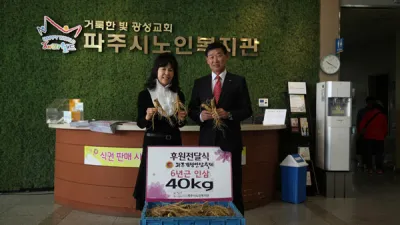 파주개성인삼 노인복지관에 전달 !- 파주시 관내 어르신에게 인삼으로 사랑을 나누다 - 파주시에서는 지난 20일 관내 어르신들에게 6년근 파주개성인삼 40kg을 파주시노인복지회관과 연계하여 전달식을 가졌다. 이번 전달식에 쓰여진 인삼은 제11회 파주개성인삼축제장에서...