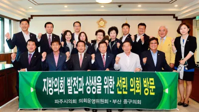 파주시의회, 부산 중구의회 벤치마킹 위해 방문 파주시의회 의회운영위원회(위원장 손배찬)는 지방의회 벤치마킹의 일환으로 부산 중구의회를 8일부터 2일간 방문했다. 이번 방문은 파주시의회와 부산광역시 중구 의회의 발전을 위하여 기획된 것으로 파주시의회가 타 지...