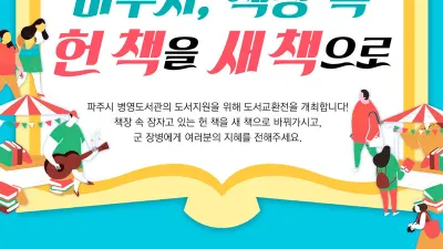 파주시, 병영도서관 활성화 위한 도서교환전 개최시민과 함께 군 장병 독서진흥 돕는 나눔 행사 파주시(시장 이재홍)는 '공직자와 시민이 함께하는 나눔·도서교환전'을 개최한다고 26일 밝혔다. 관내 병영도서관 활성화를 위한 이번 행사는 시민과 공직자를 대상으로 28일과...