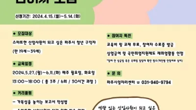 파주시, 청년 취업지원‘슬기로운 사회생활’운영 - 19세~39세 청년 20명 모집, 취업실무 무료교육 파주시가 청년 특화 취업지원 프로그램인 ‘슬기로운 사회생활’ 참여자 20명을 4월 15...