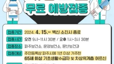 파주시, 65세 이상 취약계층에 대상포진 무료 예방접종 파주시가 4월 15일부터 65세 이상 취약계층 어르신을 대상으로 대상포진 무료 예방접종을 실시한다. 접종 대상은 65세(1959년 12월 31일 이전 출생자) 이상...