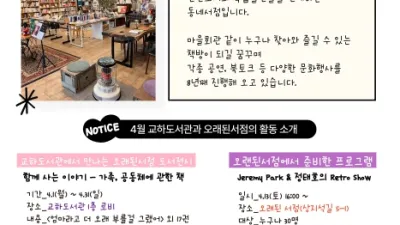 파주시 교하도서관, 지역서점과 함께 문화활동 시작 - 10월까지 공연, 도서전시 등 지역서점 활성화 사업 진행 파주시 교하도서관은 ‘지역서점 활성화 문화프로그램 지원사업’을 통해 특색 있는 독서문화...