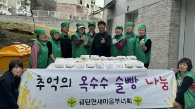 파주시 광탄면 새마을부녀회, 사랑 담긴 술빵 나눔 파주시 광탄면 새마을부녀회는 4일, 관내 취약계층에 나눔을 실천하기 위해 ‘추억의 옥수수 술빵 나눔’ 행사를 진행했다. 광탄면 새마을부녀회 회원들은 전날부터 정...